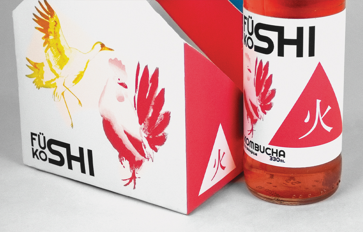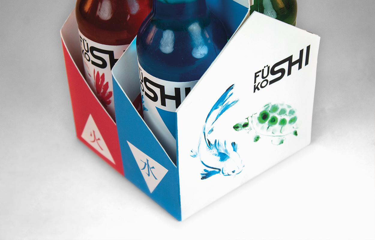 Packaging d’emballage et d’étiquette de Kombucha, le « FÜKOSHI » s’inspire du thème japonais des quatre éléments pour chaque saveur.